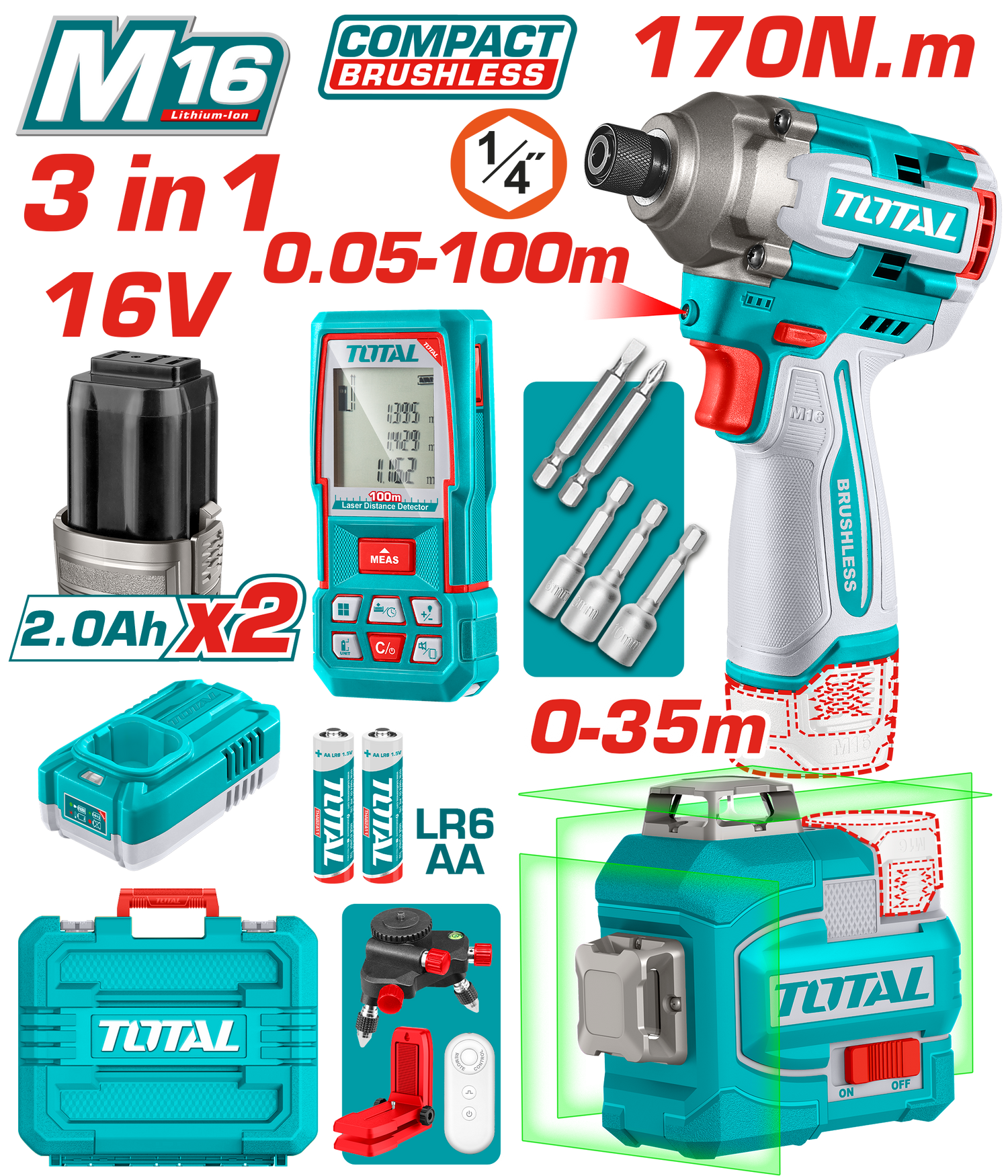Kit combo TOTAL 16V – masina de insurubat, nivela laser 3D si telemetru laser - Descriere