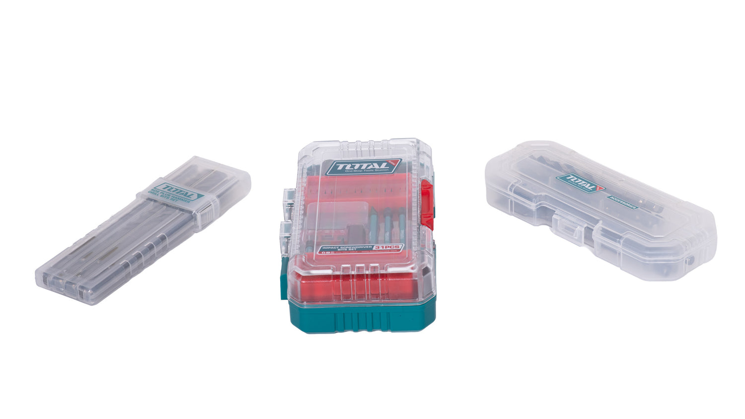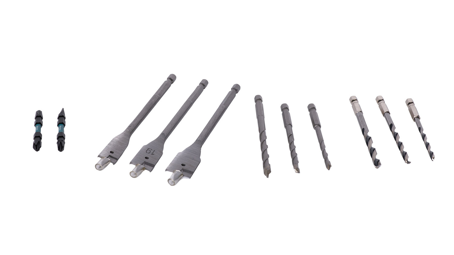 Accesorii incluse: 3 buc. burghie (8, 10, 12 mm), 1 buc. dalta, 1 buc. tub unsoare, 1 buc. cheie, 3 buc. burghie plate lemn (16, 19, 22 mm), 3 buc. burghie zidarie (5, 6, 8 mm), 3 buc. burghie HSS (4, 5, 6 mm), 2 buc. biti impact 65 mm (PH2+PH2, PH2+SL6), 1 set 31 biti impact,