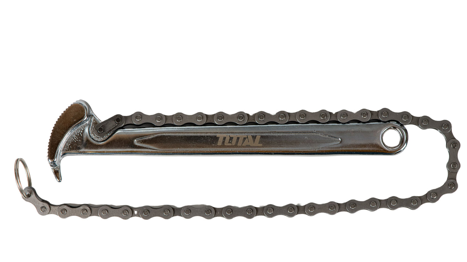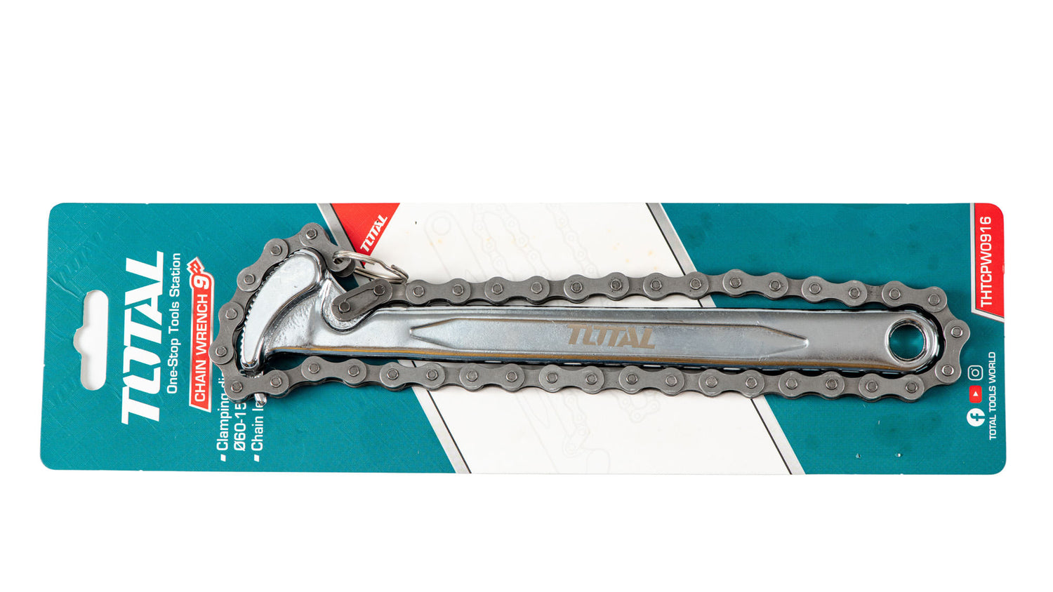 Cheia cu lant Total de 9" este conceputa pentru prinderea si fixarea tevilor si a altor suprafete rotunde, avand un diametru de prindere ajustabil intre 60mm si 150mm. Cu un lant de 520mm lungime, maner forjat si tratament termic, aceasta cheie asigura durabilitate si eficienta in utilizare, iar finisajul cromat ii ofera rezistenta suplimentara la coroziune.