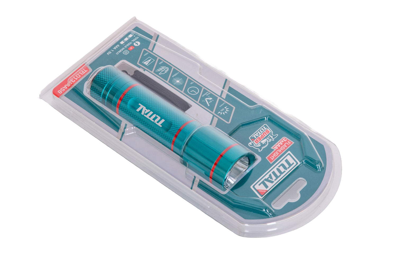 Lanterna portabila TOTAL Industrial – 250 lumeni, carcasa aluminiu este ideala pentru uz profesional sau general, oferind iluminare puternica si constructie durabila. Fabricata din aluminiu rezistent, functioneaza cu 3 baterii AAA si atinge o distanta de iluminare de pana la 160 metri.