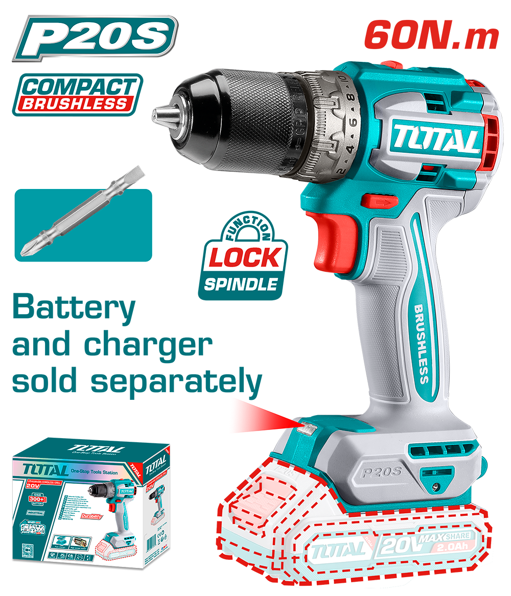 Masina de gaurit TOTAL cu motor fara perii, 60 Nm, Li-Ion 20V, fara acumulator inclus - Descriere