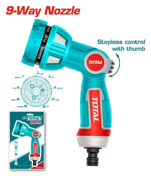 Pistol de stropit TOTAL 9 functii, metal, adaptor 3/4", reglaj debit - Descriere