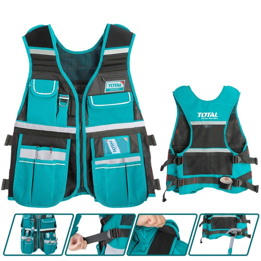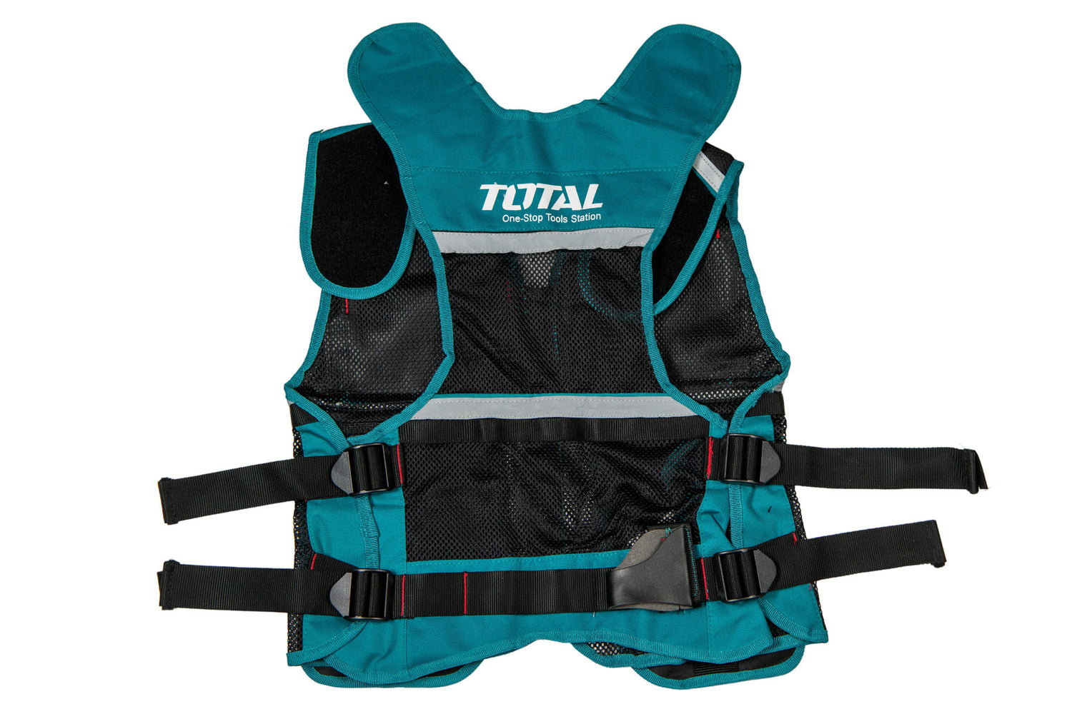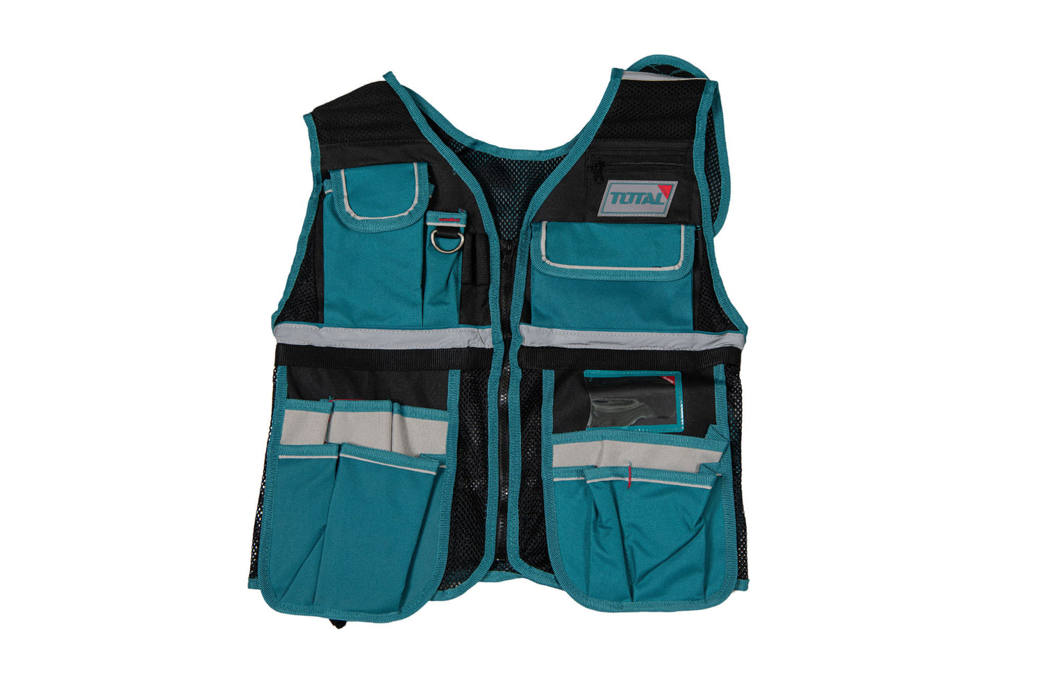 Vesta de lucru TOTAL este conceputa pentru confort si functionalitate, fiind realizata din plasa de aer pentru ventilatie optima. Dimensiunea reglabila permite ajustarea bretelelor de umar si talie pentru o potrivire perfecta. Cu 12 buzunare si un suport pentru ciocan, aceasta vesta este ideala pentru organizarea eficienta a uneltelor necesare la lucru.